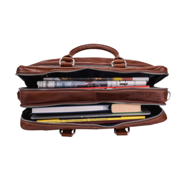 Auf die hochwertige Aktenmappe der Serie Cambridge können Sie sich verlassen! In den beiden Hauptfächern mit großzügigem Platz lassen sich zahlreiche Dokumente, Laptop oder Tablet sowie weitere Arbeitsutensilien bequem unterbringen. Neben dem Tragegriff gibt es einen Schultergurt, der für ein angenehmes Tragegefühl sorgt. Das robuste Rindsleder und das klare Design der Aktenmappe in Cognac machen sie zum idealen Begleiter für den Berufsalltag.