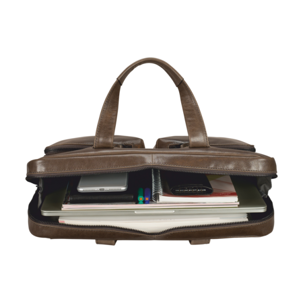 Entdecken Sie diese luxuriöse, graubraun Ledertasche im sportlichen Look, mit gepolsterten Fächern für Laptop ud Tablet. Aus echtem Vollrindleder gefertigt, besticht sie durch ein Öl-Wachs Finish und den markanten Pull-Up-Effekt. Der Innenraum bietet Stauraum für Dokumente, Laptop, Tablet und Arbeitsutensilien, während separate Außentaschen Platz für zusätzliche Papiere bieten. Der praktische Trolley Loop auf der Rückseite ermöglicht einen sicheren Halt auf Rollgepäck. Dank kurzer Henkel und Schulterriemen ist diese Ledertasche vielseitig verwendbar und verleiht Ihrem Business-Look eine sportlich-elegante Note.