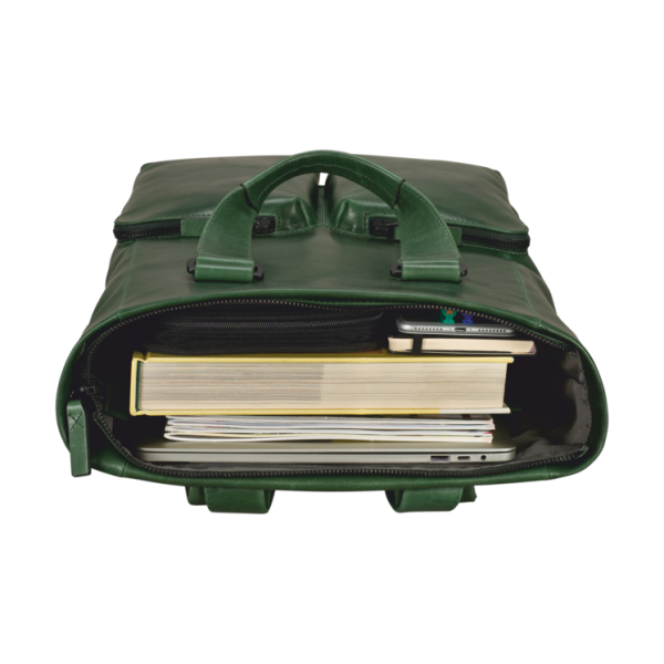 Dieser elegante, flaschengrüne Tote Bag/Business-Rucksack aus hochwertigen Vollrindleder mit Öl-Wachs Finish vereint Design und Funktionalität. Der Innenraum bietet Platz für ein großes Laptop und ein Tablet sowie Dokumente und andere wichtige Unterlagen. Die kurzen Henkel sorgen dabei für hervorragenden Tragekomfort. Mit diesem Tote Bag / Rucksack in Braun komplettieren Sie stilsicher Ihr Business-Outfit und bringen Eleganz in Ihr tägliches Geschäftsleben.