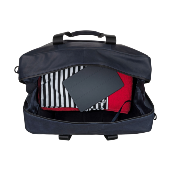 Die schicke Reisetasche eignet sich ideal als Weekender und bietet genügend Platz für das Gepäck eines Wochenendtrips. Ihr zeitlos elegantes Design wird durch das blaue hochwertige Vollrindleder unterstrichen. Dank des abnehmbaren Tragegurtes kann die Tasche auch bequem über der Schulter getragen werden. So sind Sie immer stilvoll unterwegs.