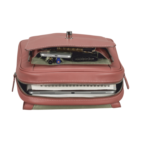 Der schicke Leder-Rucksack aus fein genarbtem Rindsnappa und veredelt mit natürlichen Wachsen, ist der perfekte Begleiter für Ihren Office-Alltag. Im geräumigen Innenraum finden außer einem 11-Zoll Laptop und einem 10-Zoll Tablet auch wichtige Unterlagen und Utensilien bequem Platz. Die beiden individuell anpassbaren Schultergurte sorgen für perfekten Sitz und der praktische Trolley Loop sicheren Halt auf Rollgepäck. In elegantem Altrosa unterstreicht dieser hochwertige Rucksack gekonnt Ihr Business-Outfit und setzt stilvolle Akzente.