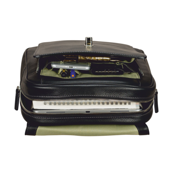 Der schicke Leder-Rucksack aus fein genarbtem Rindsnappa und veredelt mit natürlichen Wachsen, ist der perfekte Begleiter für Ihren Office-Alltag. Im geräumigen Innenraum finden außer einem 11-Zoll Laptop und einem 10-Zoll Tablet auch wichtige Unterlagen und Utensilien bequem Platz. Die beiden individuell anpassbaren Schultergurte sorgen für perfekten Sitz und der praktische Trolley Loop sicheren Halt auf Rollgepäck. In elegantem Schwarz unterstreicht dieser hochwertige Rucksack gekonnt Ihr Business-Outfit und setzt stilvolle Akzente.
